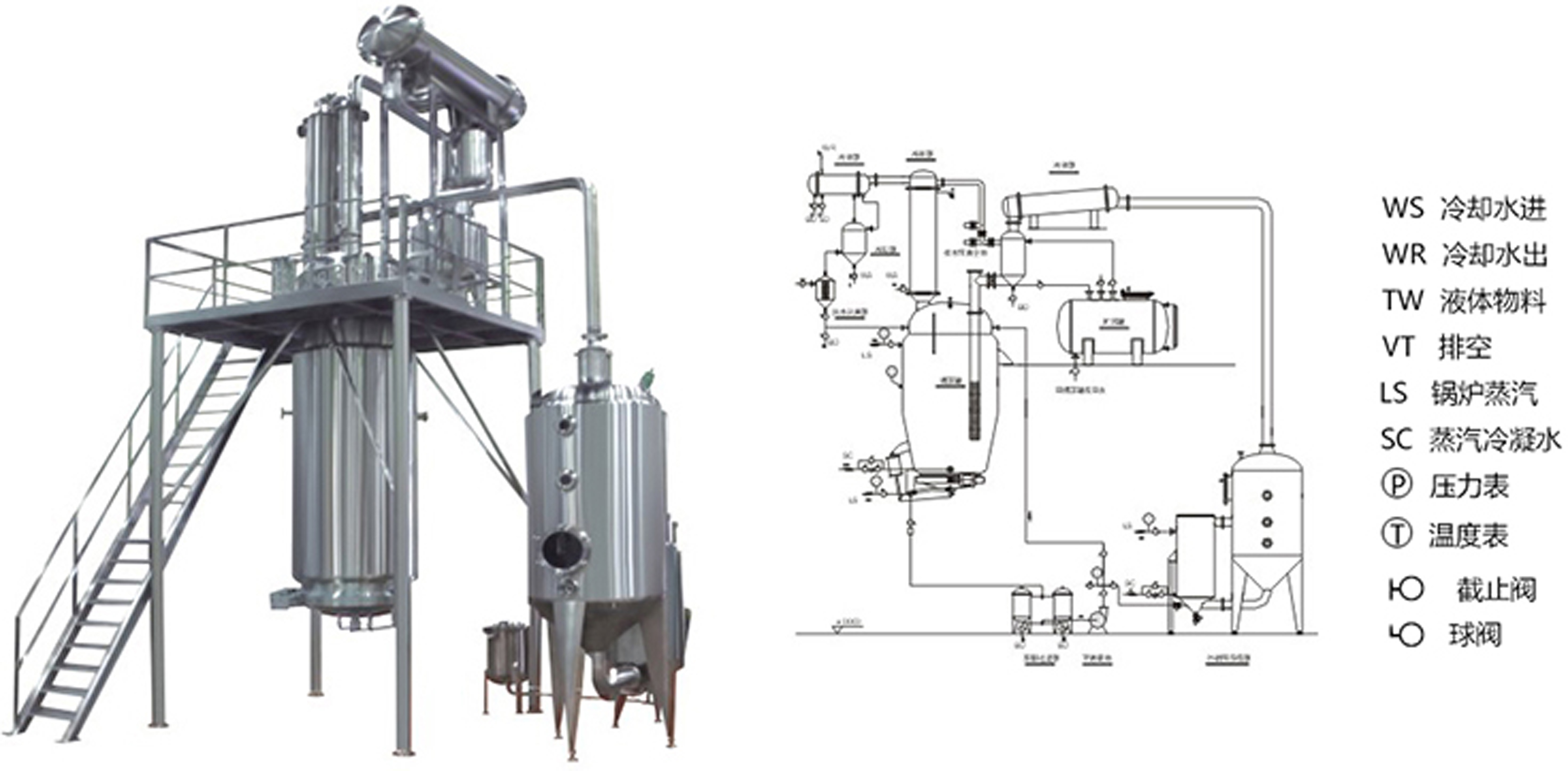 中的可溶性有效成份溶解于提取罐內溶劑。提取液經抽濾管抽入濃縮器、濃縮產生的二次蒸汽又送到提取罐作熱源和新溶劑,這樣形成的新